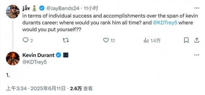 网友:“就凯文-杜兰特整个职业生涯中的个人成功和成就而言:你会把他在历史上排在什么位置?@KDTrey5,你会把自己排在什么位置?”