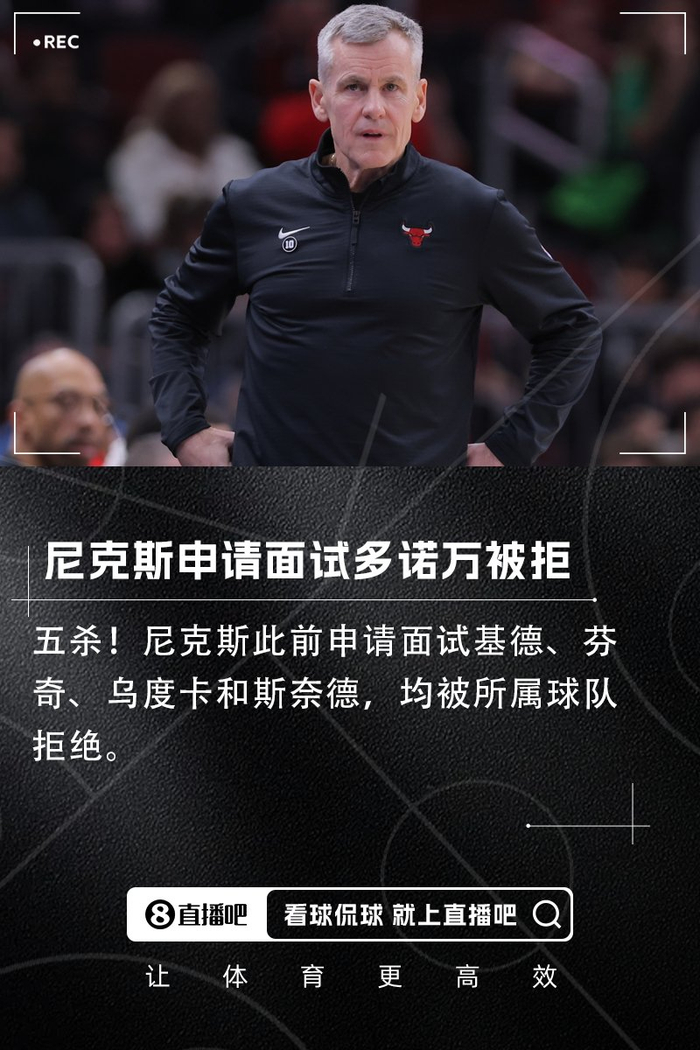 此前,尼克斯申请面试芬奇(森林狼)、乌度卡(火箭)、基德(独行侠)和斯奈德(老鹰),均被所属球队拒绝。