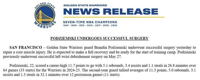 勇士队后卫波杰姆斯基于昨日成功接受手术,修复核心肌肉损伤。预计他将完全康复,并为训练营的开始做好准备。此前,波杰姆斯基在5月27日成功接受了左手腕清创手术。