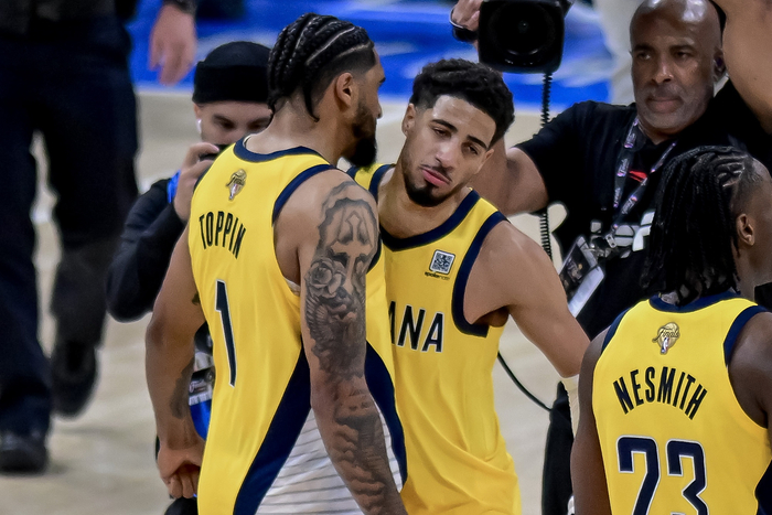 直播吧6月12日讯 NBA总决赛,步行者主场116-107战胜雷霆,总比分2-1领先。赛后哈利伯顿在接受采访时谈到了队友托平的表现。