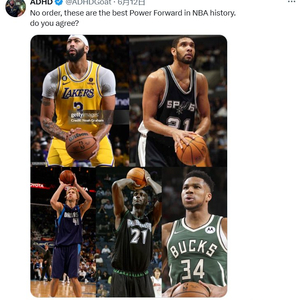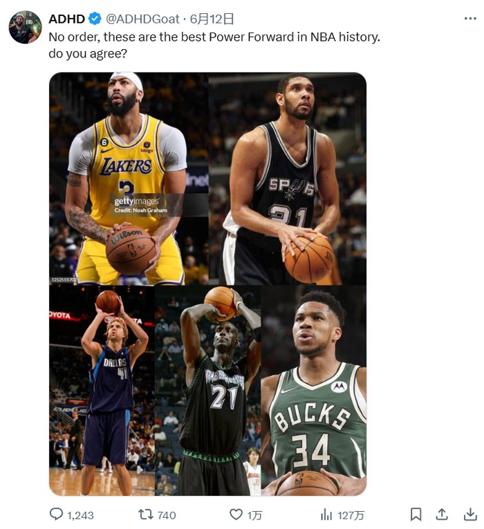 浓眉邓肯司机KG字母!美媒晒图:这几个人就是历史最强的大前锋!