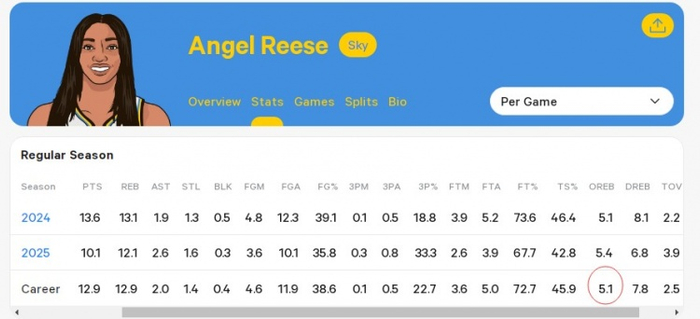 据统计,她的职业生涯场均进攻篮板达到5.1个,这使她与摩西-马龙并列WNBA&NBA历史场均进攻篮板最多的球员,第二是罗德曼(4.8个)。