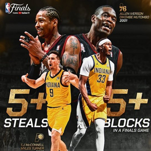 在G3里,麦康纳送出5次抢断,特纳送出5次盖帽,上次总决赛有队友同场比赛达成这两项数据是01年76人的艾弗森和穆托姆博。