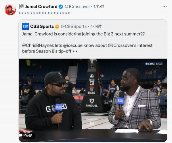 开始造势!克劳福德转发自己有意加盟BIG 3的消息并配文:👀