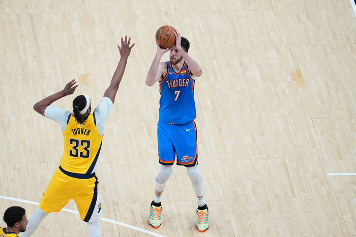直播吧6月15日讯 昨天NBA总决赛G4,雷霆在客场111比104击败步行者,大比分2比2。赛后,切特-霍姆格伦接受了采访。