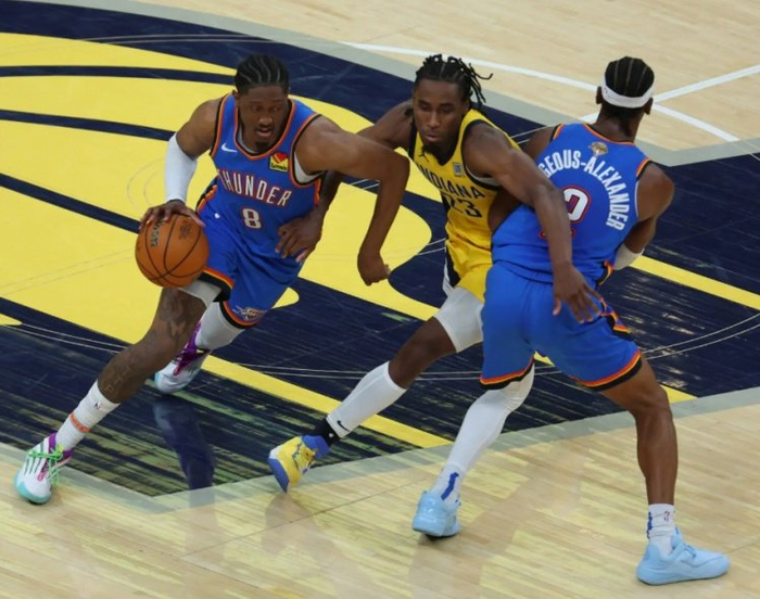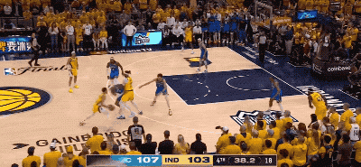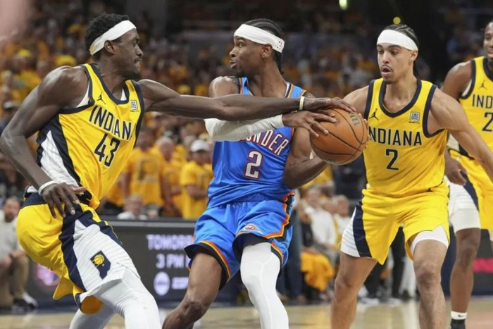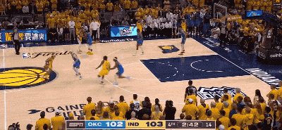 在拳拳到肉的决胜时刻,雷霆队拿出了他们一贯的防守侵略性,逼迫每一个持球的步行者球员赶紧把球分出去而不是攻击篮筐。