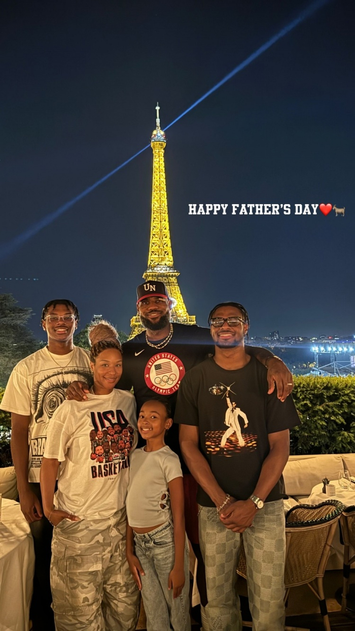 布莱斯晒出一张他和父亲勒布朗、哥哥布朗尼、母亲萨瓦娜和妹妹Zhuri去年奥运会期间在巴黎的合影,并写道:“父亲节快乐❤️🐐”