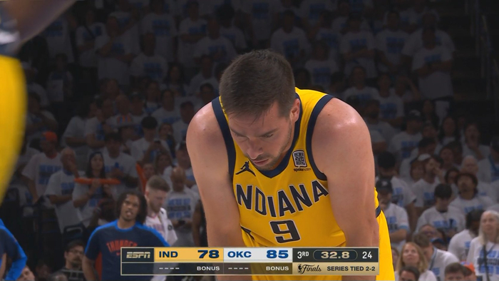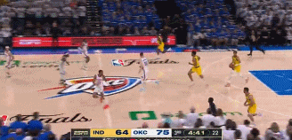 直播吧06月17日讯 总决赛天王山之战,三节结束,步行者79-87落后雷霆8分。