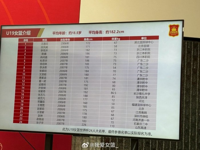 在今天中国篮协举行的中国篮球媒体日上,相关负责人介绍了中国U19女篮的备战情况。信息显示,中国U19女篮参加U19世界杯前还将在法国进行最后的热身练兵。国青女篮征战U19世界杯的最好战绩是2005年的第三名,上届赛事最终获得第13名。图一为球队24人集训名单,非参赛名单。