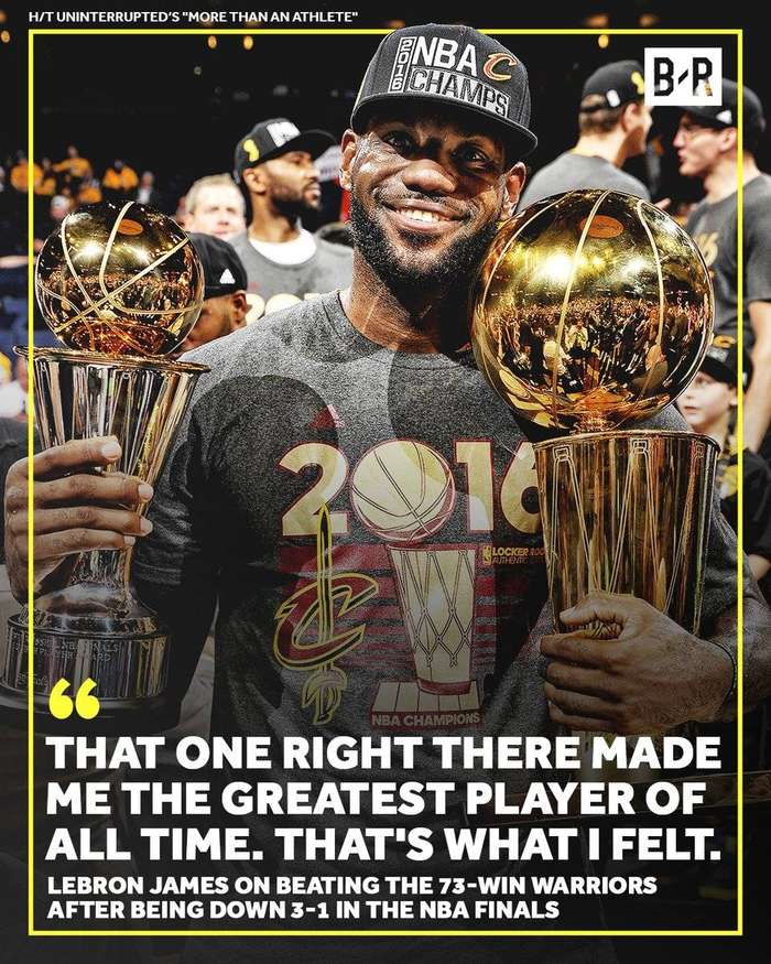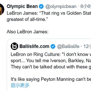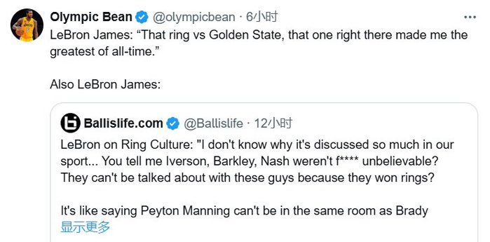 美媒搬出了詹姆斯在2018年的一段采访,表示詹姆斯的言论自相矛盾,当时,詹姆斯表示:“2016年对勇士的那个总冠军,让我觉得我自己是史上最佳球员。”