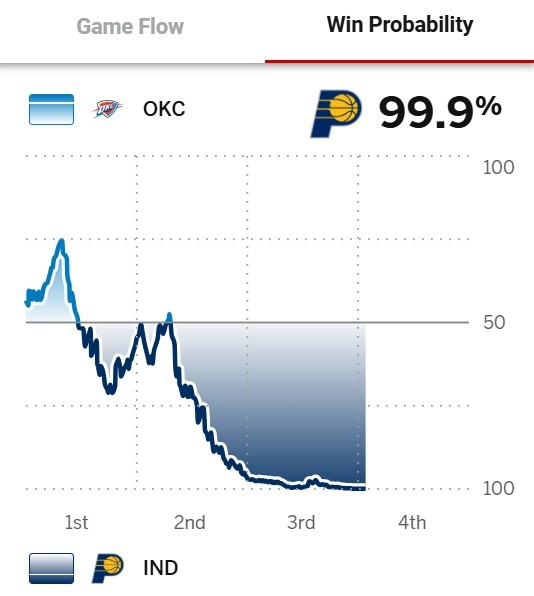 步行者前三节领先30分!ESPN实时胜率:步行者99.9% 雷霆0.1%