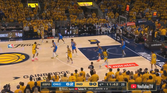 雷霆场上阵容为:卡森-华莱士、阿隆-维金斯、阿杰伊-米切尔、肯里奇-威廉姆斯、杰林-威廉姆斯
