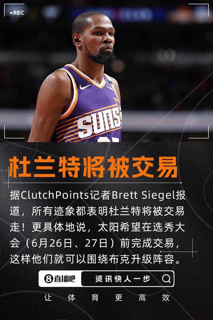 所有迹象都表明杜兰特将被太阳交易走!更具体地说,太阳希望在选秀大会(6月26日、27日)前完成交易,这样他们就可以围绕明星后卫布克升级阵容,布克仍是球队的核心。