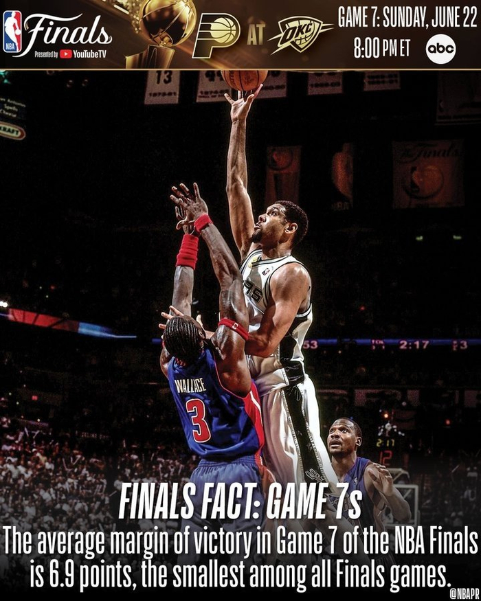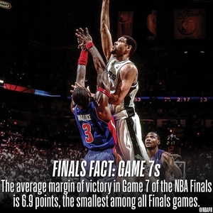 NBA官方今天发布了关于总决赛抢七的数据,在总决赛抢七中,平均净胜分是6.9分,是总决赛历史上七场中净胜分最小的一场。