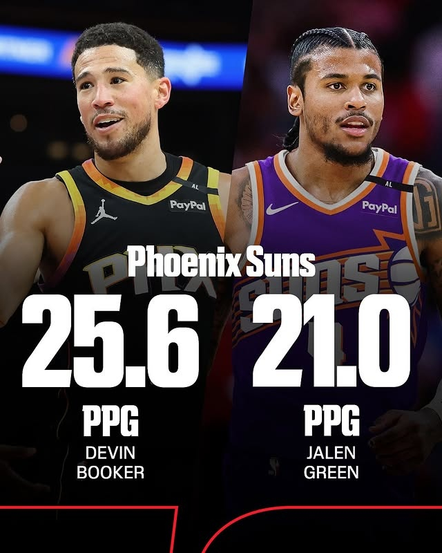 本赛季杰伦-格林场均砍下21.0分,布克场均25.6分,他们也是本赛季第三组场均都砍下20+的后场组合,另外两组是湖人的东契奇+里夫斯、骑士的米切尔+加兰。