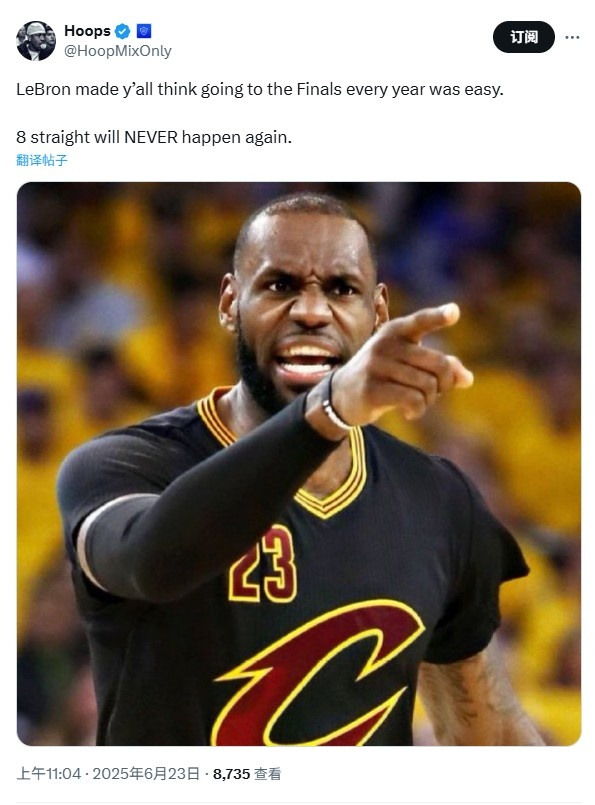赛后,美媒Hoops发推写道:“詹姆斯让人觉得每年都进总决赛很容易,但连续8年进总决赛再也不会出现了!”另一美媒Playmaker回复道:“当你想到这个的时候都会觉得很疯狂。”