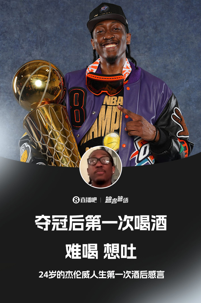 “昨天是我第一次喝酒,之前我没有喝过酒。赛季开始的时候,他们就很想让我喝酒,我不知道为什么这件事对他们来说那么重要。我就跟他们说,如果我们拿到总冠军,我就喝。”杰伦威说,“我喝了一些,喝了几杯香槟、啤酒,难喝死了,想吐。我以后还是坚持喝秀兰邓波儿(又名石榴柠檬水,是一款无酒精调酒)吧。”