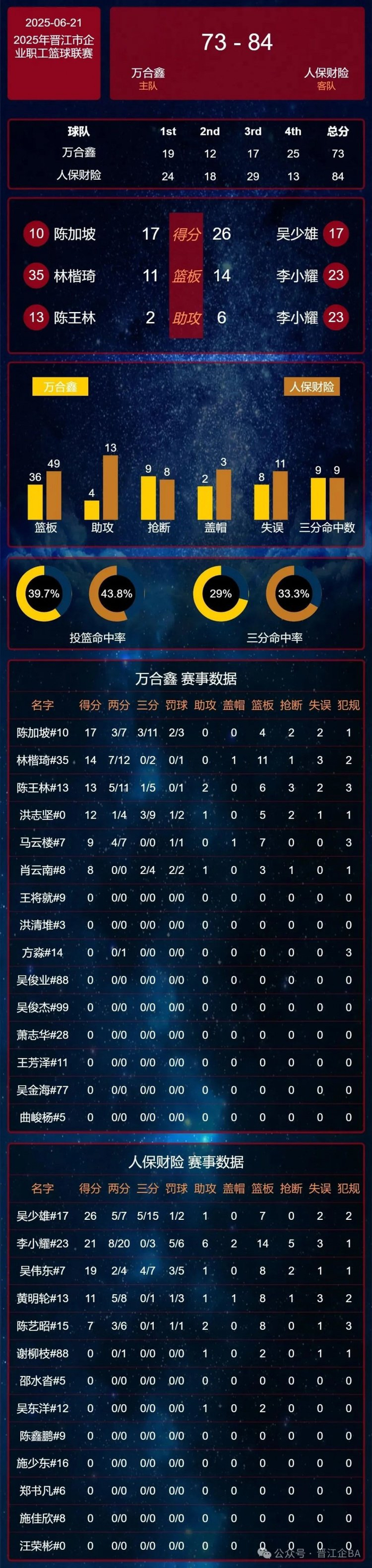 本场比赛,人保财险吴少雄发挥出色,全场砍下26分,成为球队取胜的关键先生,并荣膺决赛MVP。而万合鑫全队同样发挥出色,虽败犹荣。感谢两支球队为我们带来的这场精彩绝伦的篮球盛宴!