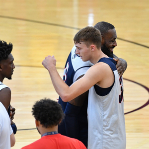 詹姆斯说:“是的,他在陪练队里。他的表现非常出色。最近几年我都在看库珀打球,我儿子布朗尼在耐克青年精英赛上打AAU篮球,所以我们会在佐治亚州打Peach Jam比赛,或者在堪萨斯城、达拉斯、印第安纳波利斯等地参赛。库珀和许多孩子不一样,他为他家乡缅因州的球队效力。许多孩子会被招募到别处,库珀就一直和他从小长大的双胞胎哥哥以及伙伴们一起打球,我忘了他的球队的名字,但他和他哥让他的球队具备竞争力,对阵的都是那些阵容豪华的球队。我认为那很酷,因为我记得我当年也是那样的,我代表俄亥俄州东北部的Shooting Stars队出战,我和我的小伙伴们一起打球,一起长大,我们必须对阵全国最好的那些球队。我觉得那样很酷。不过他是一位天赋异禀的球员。”