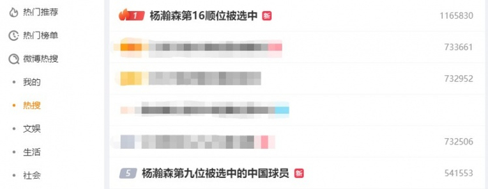 这一新闻迅速冲上了微博热搜,词条“杨瀚森第16顺位被选中”高居榜首,“杨瀚森第九位被选中的中国球员”则排名第5。