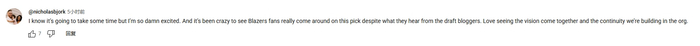 我知道这需要一些时间,但我真的很兴奋。尽管很多人在播客里对他议论纷纷,但开拓者球迷们真的喜欢上了这个选择,这真是太不可思议了。很高兴看到未来逐渐成型,也很高兴看到我们在球队中建立可持续性。