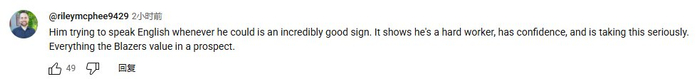 他一有机会就努力说英语,这是一个非常好的迹象,说明他很努力,很自信,而且很认真的对待这件事,这正是开拓者看重的潜力球员的特质。