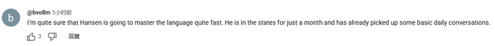 我相信杨瀚森很快就会掌握英语,他才来美国一个月,就已经学会了一些基本的日常对话。