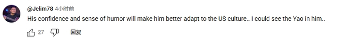 他的自信和幽默将让他更好地适应美国文化,我能在他身上看到姚明的影子。