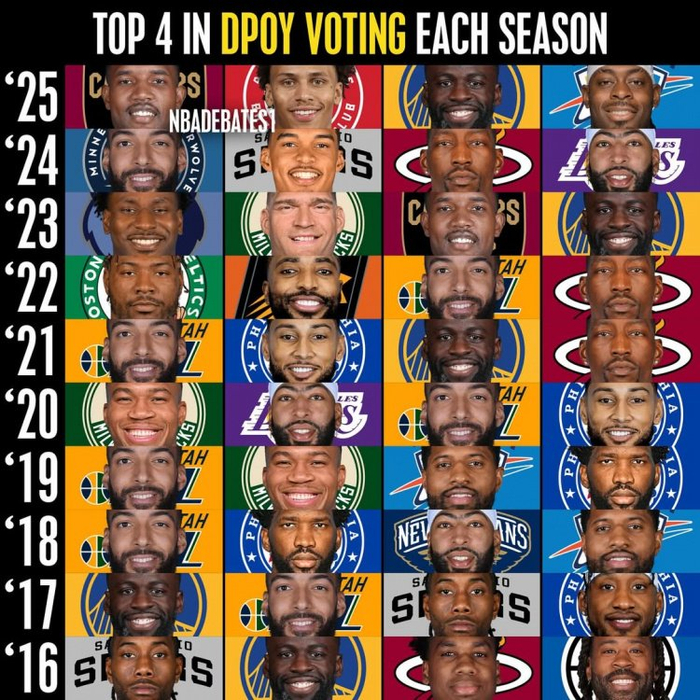 ️近10年DPOY前4:戈贝尔追梦浓眉热巴多次入围 本西21年险夺魁