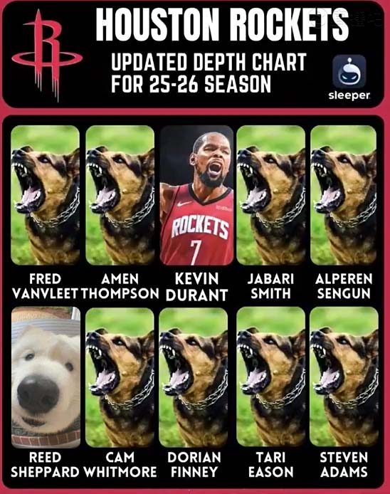 火箭下赛季阵容:杜兰特+8只凶狠猎犬+1只萌萌萨摩耶