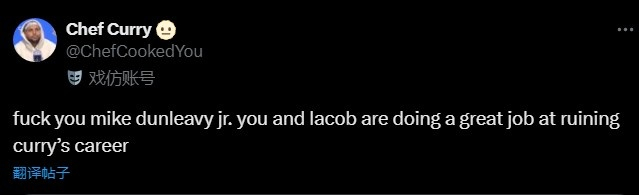 “突发新闻:小迈克-邓利维忘记了今天是自由球员市场。有消息称他被诊断患有痴呆症。勇士队不打算将他从球队经理的职位上撤下来。迈克-邓利维,你和拉科布正在毁掉库里的职业生涯。”Chef Curry又写了一条。
