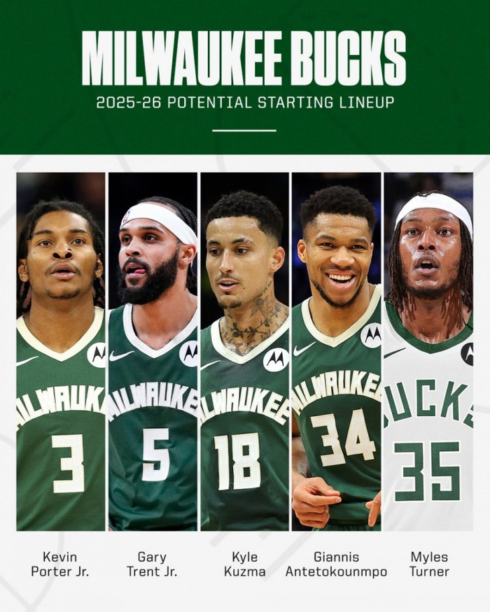 ESPN列出了他们下赛季潜在首发阵容:字母哥+特纳+库兹马+小波特+小特伦特。