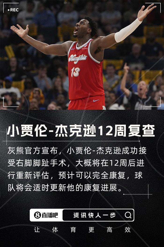 直播吧07月03日讯 灰熊官方宣布,球队内线核心小贾伦-杰克逊成功接受右脚脚趾手术,大概将在12周之后进行重新评估,预计可以完全康复,球队将会适时更新他的康复进展。