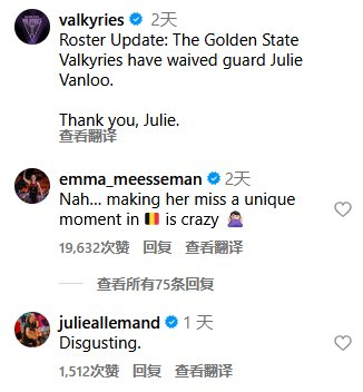 不过对于国家队队友的此次遭遇,前WNBA总决赛MVP梅斯曼则选择了直接开怼——先是在转发为范卢声援的动态写道:“永远别忘了运动员也是人。”另外也在女武神官宣裁掉范卢的动态下写道:“不儿……让她错过在比利时这个独一无二的时刻,这也太扯了。”而与范卢一同返回WNBA报道的阿莱曼德则评论:“Disgusting(恶心)。”