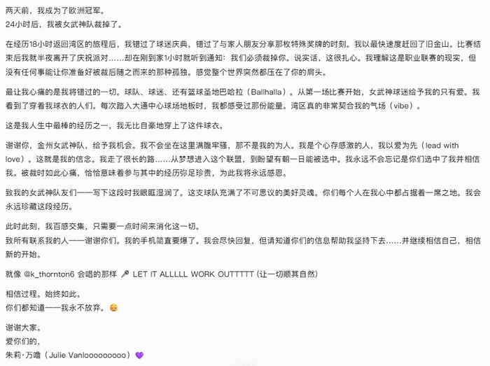 昨日,范卢发了篇长文,不过其中并未指责球队的操作,而是感谢女武神给了自己机会,感谢女武神的队友们,感谢湾区球迷的热情,并表达了自己将继续前行、不会放弃。