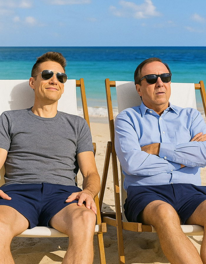 GSW Ball Report晒出勇士总经理小邓利维和老板拉科布一起度假的合成图,并写道: