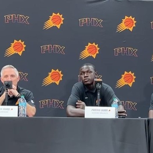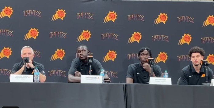 直播吧7月8日讯 今天,太阳为球队新秀举行了新闻发布会。10号秀马卢阿奇(图左二)接受了采访。