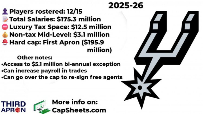 马刺目前已经被第一硬帽,他们的总薪资不能超过1.95亿,还有2000万距离。