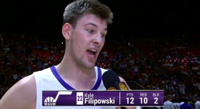 上半场,爵士球员菲利波夫斯基表现出色,出战13分钟,投篮9中3,三分球6中2,罚球5中4,拿到12分10篮板1助攻2盖帽的数据。