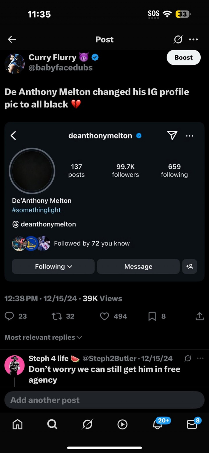 👀回勇士有戏?梅尔顿再次关注勇士 此前受伤后曾取关勇士