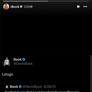 布克本人转发了自己在2015年13顺位被太阳选中,落地菲尼克斯后的推文:“很兴奋地宣布我落地菲尼克斯了,准备开干@太阳队”并配文写道:“再次开干!”