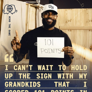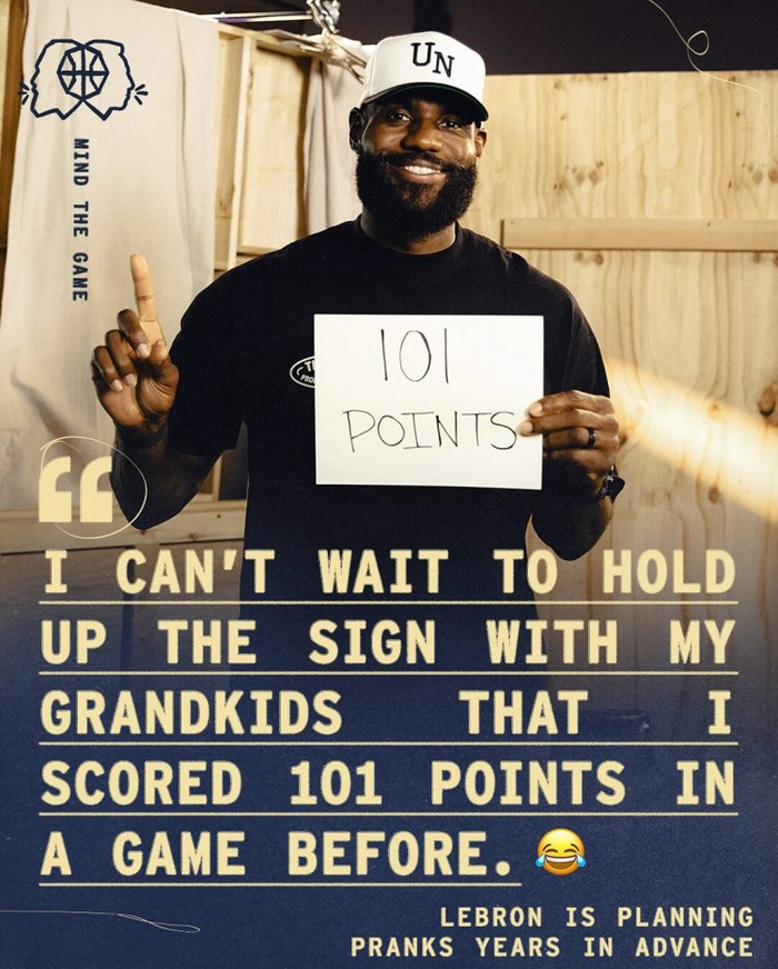 詹姆斯在本期节目中在谈到未来生涯时打趣道,“我等不及和我的孙子辈举起那张写有我在之前某场比赛中得了101分的告示牌了。”