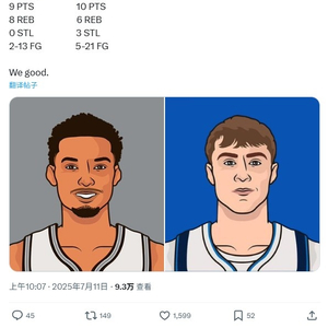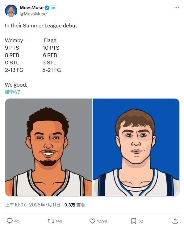 独行侠自媒体晒出弗拉格和文班亚马的夏联首秀数据对比,并写道:“我们挺好的。”