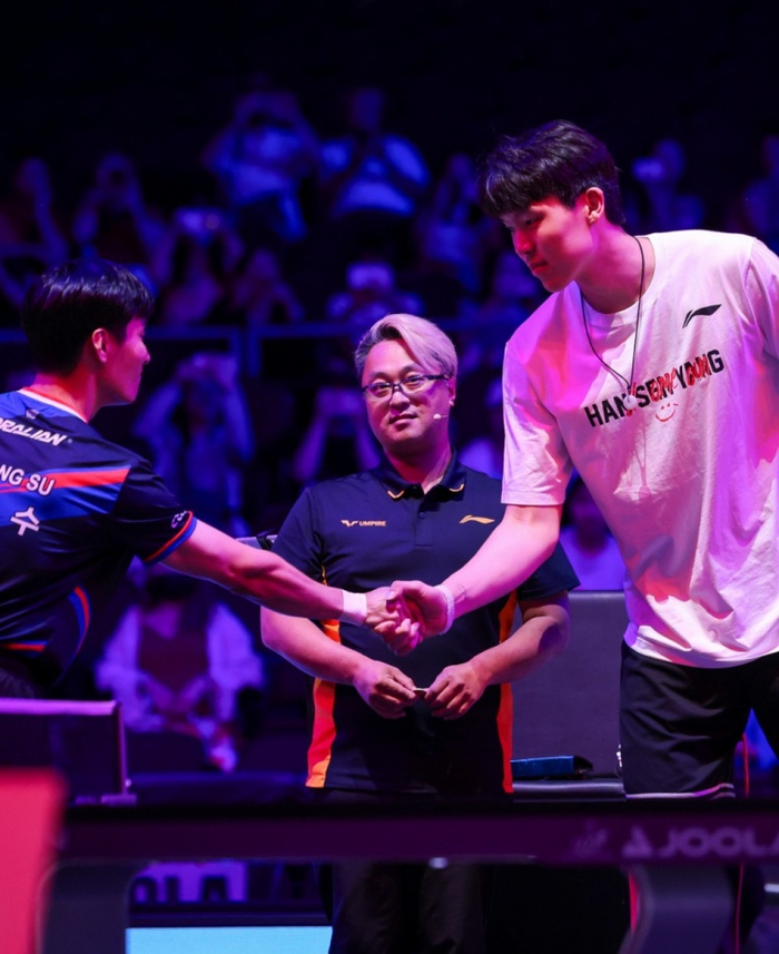 直播吧7月11日讯 乒乓球WTT美国大满贯男单1/8决赛,中国选手王楚钦对阵韩国选手李尚洙,杨瀚森来到现场为比赛挑边。