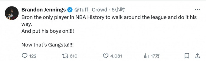 直播吧7月12日讯 今天,前NBA球员布兰登-詹宁斯更新了社媒,谈到了詹姆斯。