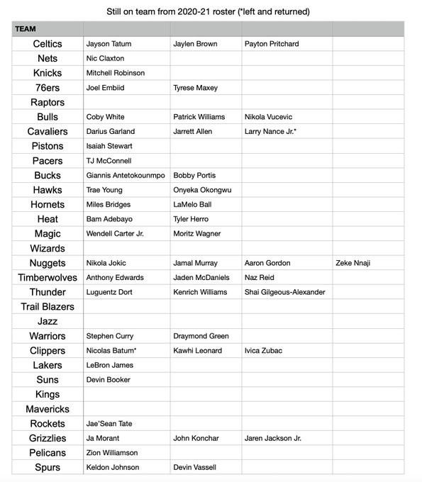 直播吧7月12日讯 快船记者Law Murray统计了各支球队20-21赛季至今仍然还在球队的球员(下表),都不超过4个,其中猛龙、奇才、开拓者、爵士、国王和独行侠都是0个。