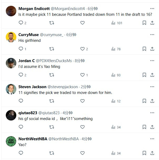 网友纷纷做出大胆猜测:“这是致敬姚明”,“这代表着他是开拓者用11号签换的16号签”,也有网友称这是代表其女友。