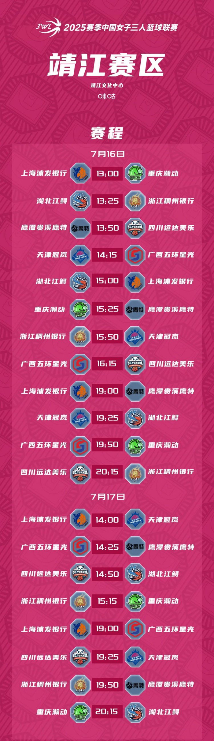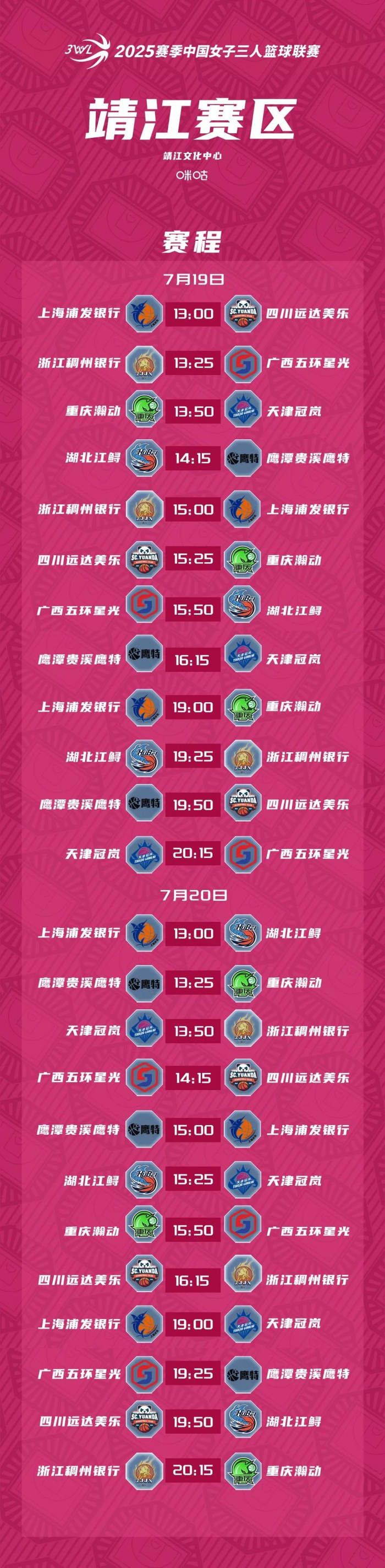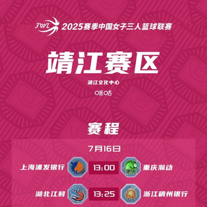 2025赛季中国女子三人篮球联赛(简称“3WL”)第3~4站巡回赛将分别于7月16日-7月17日和7月19日-7月20日在靖江文化中心赛区举办,赛程已发布。