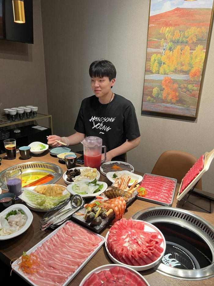 可以看到,杨瀚森的餐桌前摆放着丰盛的餐食,有牛肉、虾、毛肚、青菜等,火锅搭配烤肉。