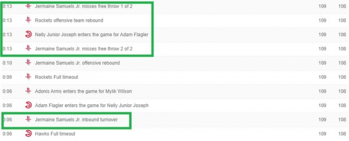 有趣的是,就在发球失误前7秒钟,萨缪尔斯两罚不中